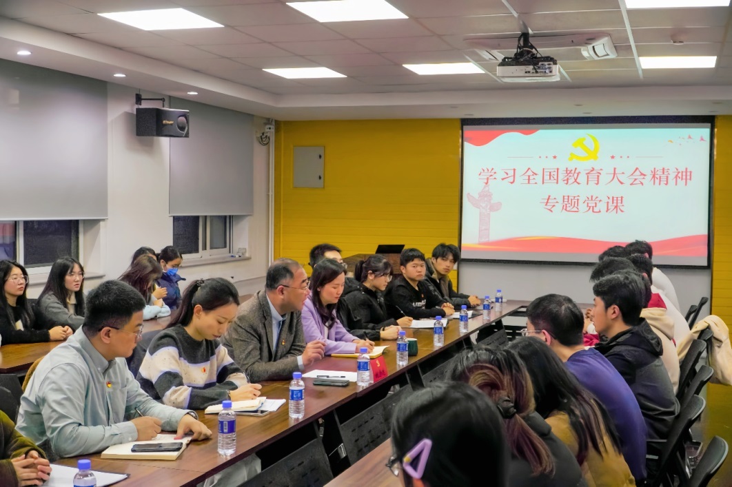 本次活动以学习全国教育大会为主题,组织了专题党课学习、学生党员领学分享、党员交流学习体会三个环节。支部书记李治锦结合支部建设情况做了汇报,七名学生党员代表分别围绕“奋楫笃行,挺膺担当”“育德铸魂,落实立德树人根本任务”等主题结合学习心得以及自身经历,分享了学习全国教育大会精神的体会和感悟。与会人员结合前期学习成果以及自身学习经历进行充分交流讨论。胡祥萍勉励大家要持续加强理论学习,理论与实践相结合,提高党团支部的组织力、引领力、服务力,加强交流互鉴和实践创新,不断提升综合素质和能力水平,为教育强国建设贡献更多的智慧和力量。